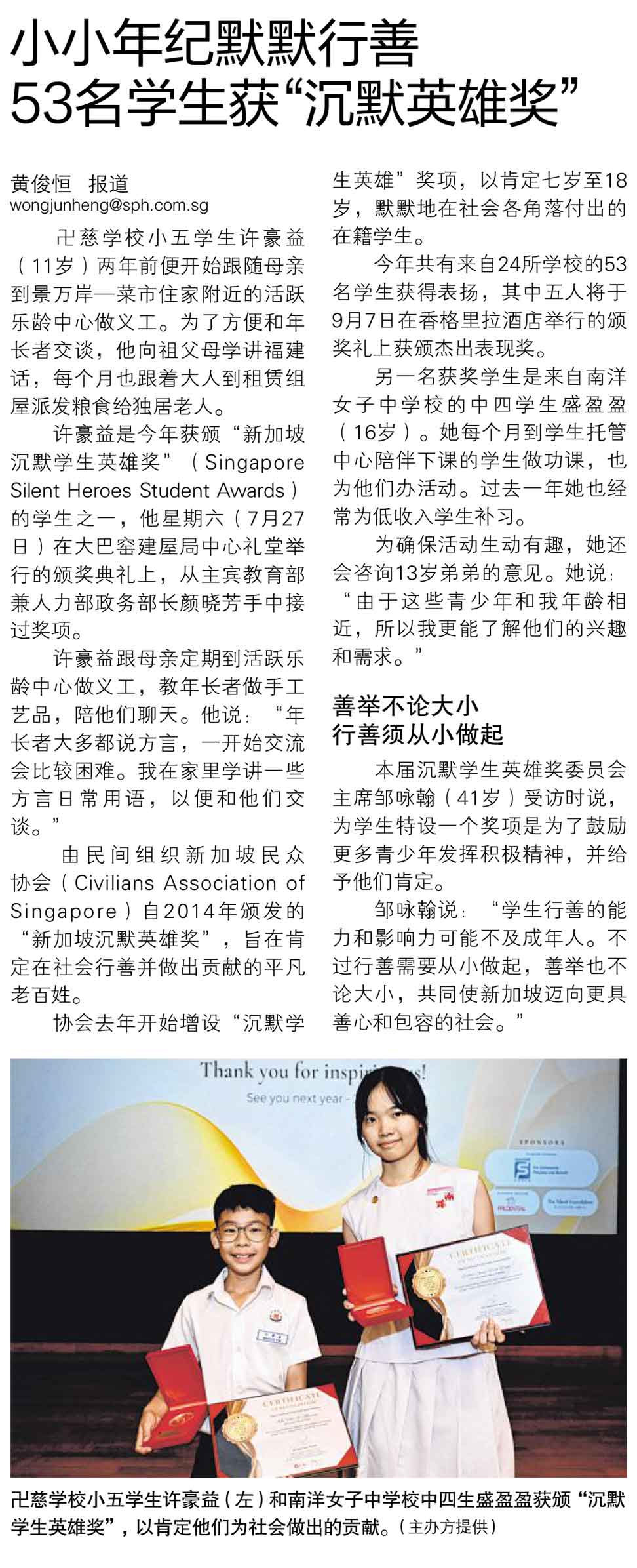 53 students who silently performed good deeds at a young age won the “Silent Hero Award”) – Lianhe ZaoBao